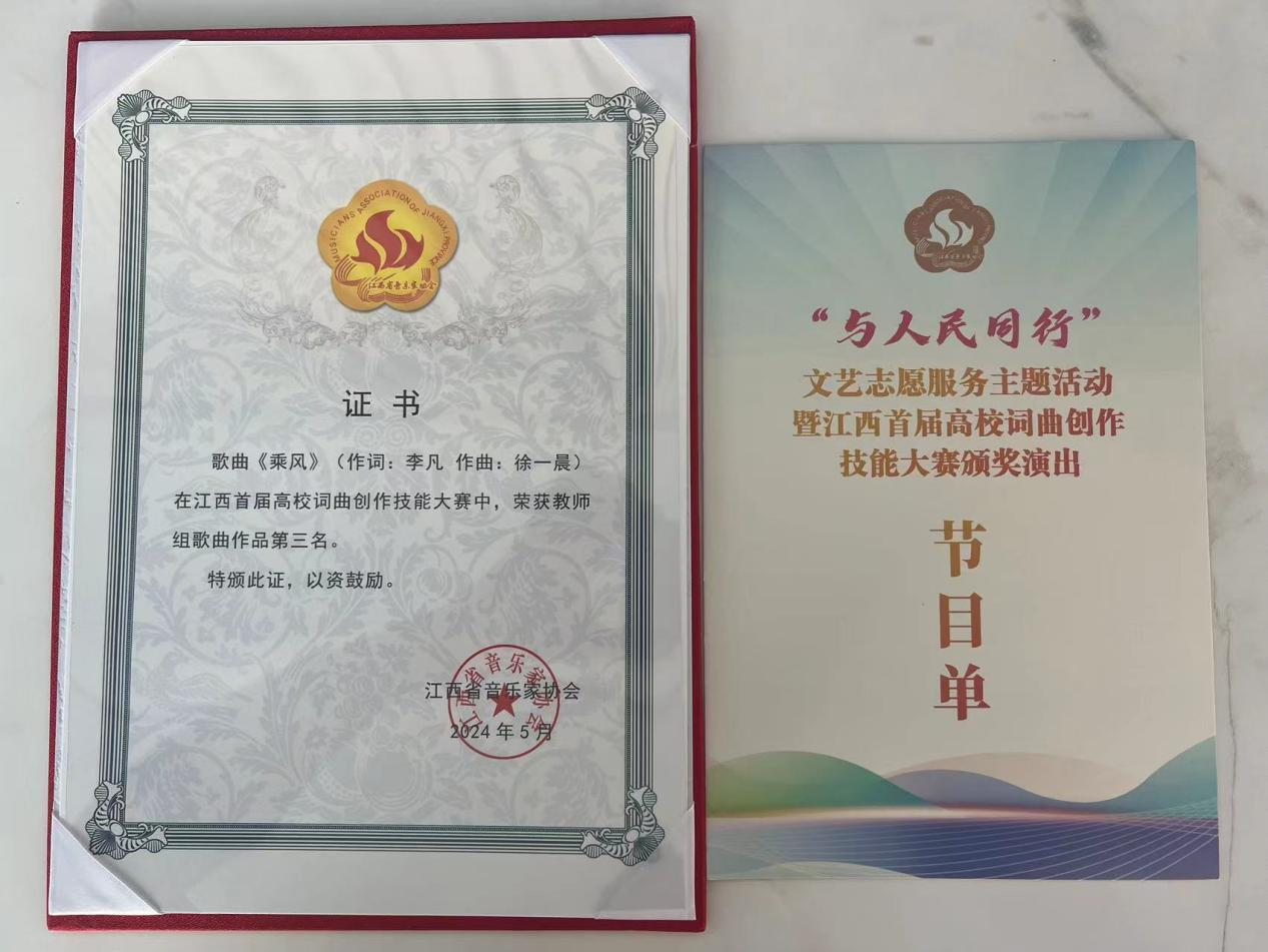 近日,在江西省首届高校词曲创作技能大赛中,色片教师徐一晨创作的歌曲《乘风》荣获教师组作曲三等奖,歌曲演唱:谭跃军老师(退休),编配录制:徐一晨 。