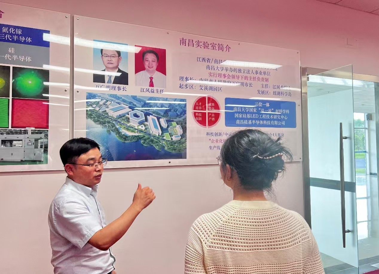 南昌大学国家硅基LED工程技术研究中心实验室王立教授向我们回忆习近平总书记指出“核心技术是买不来的”,“我国发展必须依靠创新”掌握核心技术。王教授介绍了实验室科技创新、成果转化、人才培养、科教融合的情况和“一核引擎 四轮驱动 五链融合”的发展战略。然后,队员们参观了展厅。